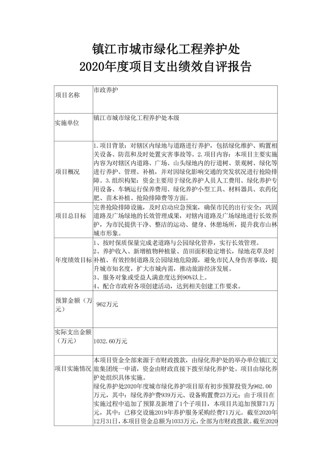 镇江市城市绿化养护处2020年度市政养护项目绩效评价自评报告