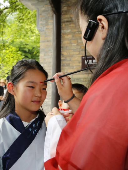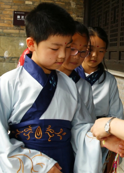 点朱砂,又名朱砂开智。就是用朱砂为刚刚入学的孩子的额头正中点上红痣,这又称之为“开天眼”。“痣”通“智”,意为开启智慧,以此寄托美好的愿望,寓意着孩子从此眼明心明,好读书,读好书。此外,每每进入端午节,蚊虫出没,给小孩子额头点上朱砂,也寓意孩子们身体健康、平平安安。